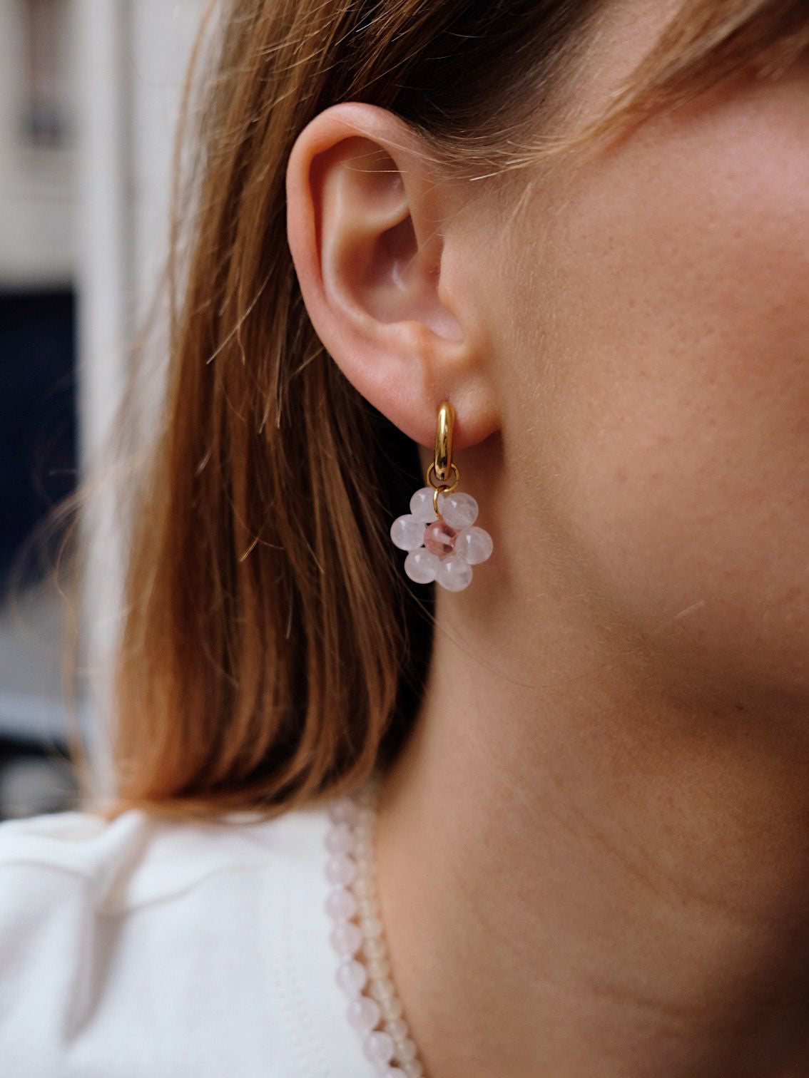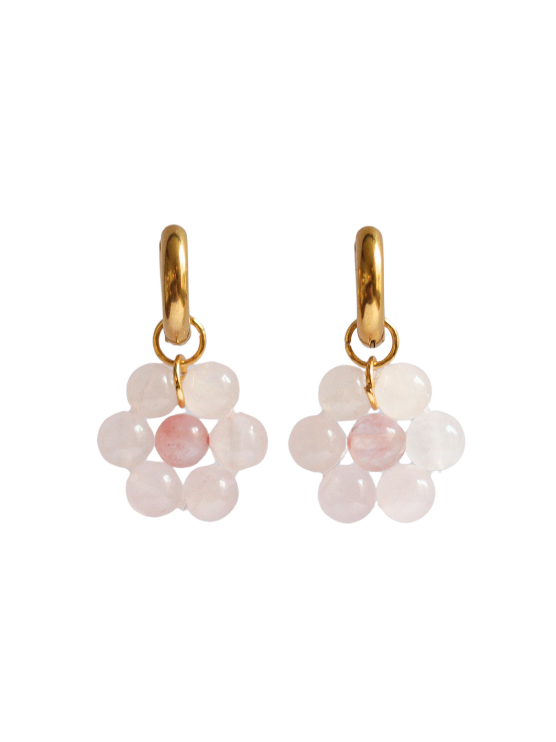 Les créoles Flore sont réalisées à partir de pierres naturelles formant une délicate fleur, associées à des créoles de 14 mm en acier inoxydable.