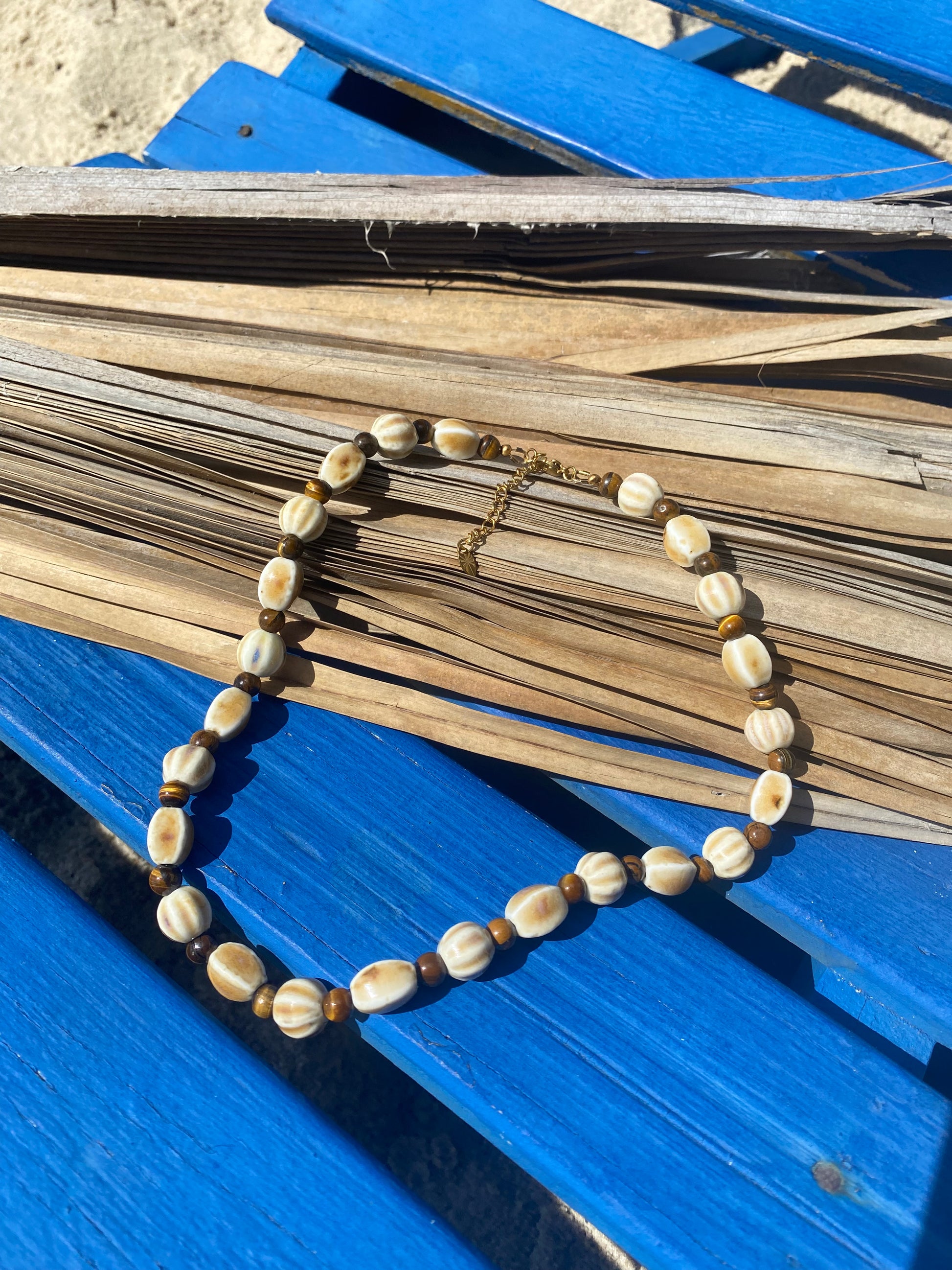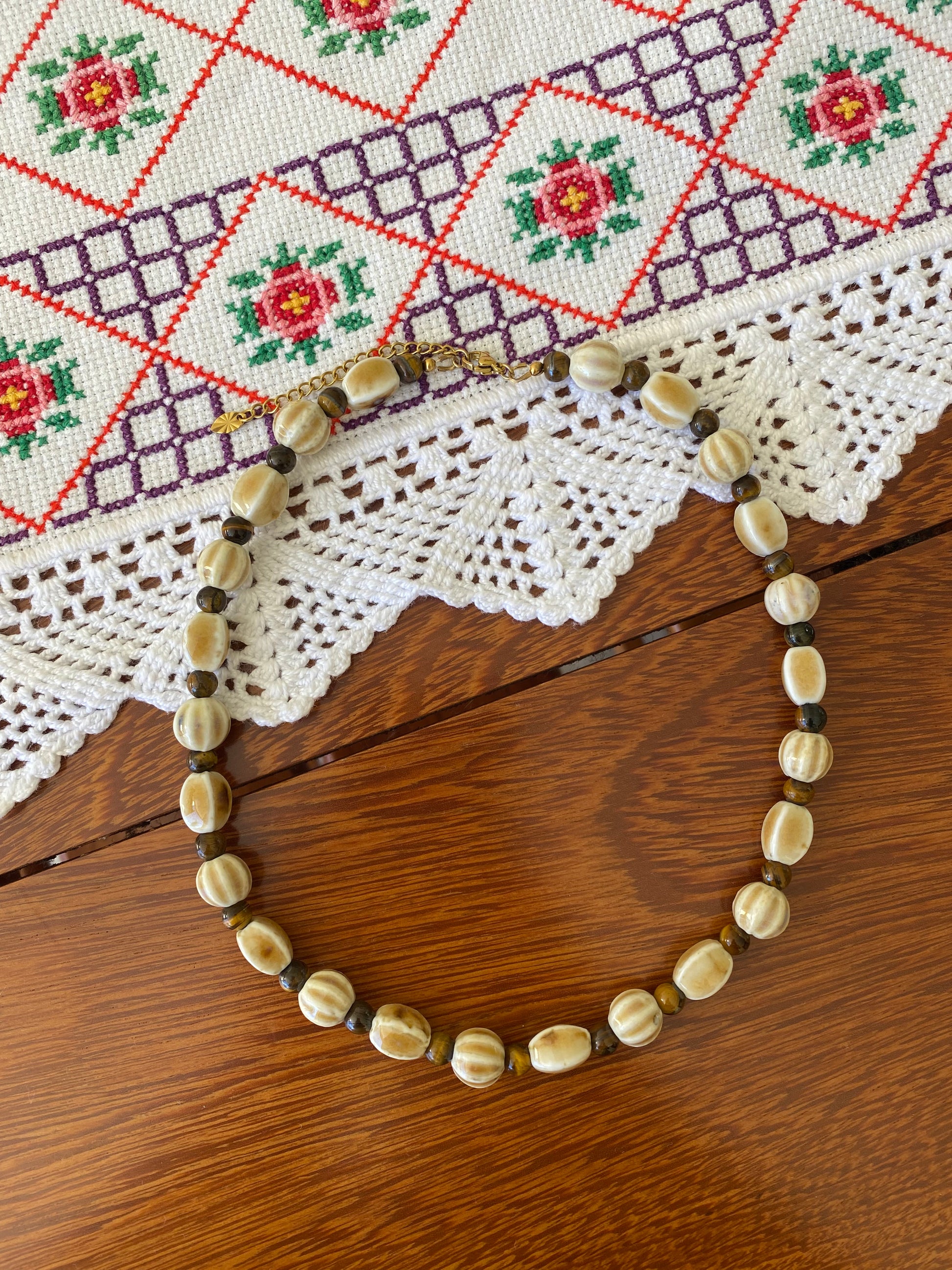 Collier Iara composé de perles en céramique beige/écru marbré et de perles naturelles marron.