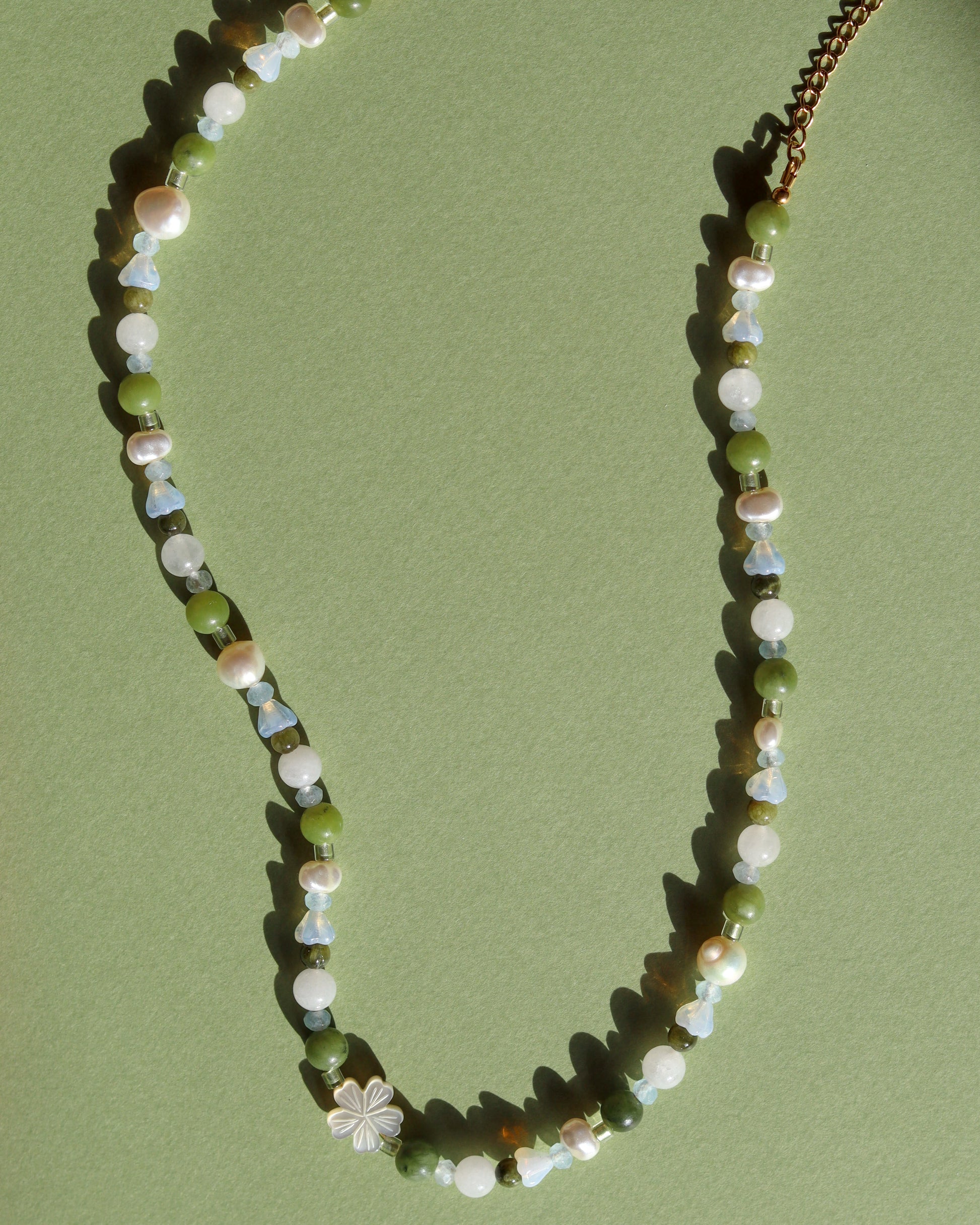 Le collier Flore est composé de perles d'eau douce, de pierres naturelles, de perle de nacre, et de perles miyuki.